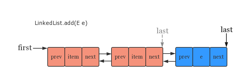 add(E e) 方法用于向链表的尾部添加结点,因为有 last 指向链表的尾结点,因此向尾部添加新元素只需要修改几个引用即可,效率较高