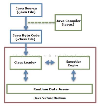 1.类加载器(ClassLoader):在JVM启动时或者在类运行时将需要的class加载到JVM中。(下图表示了从java源文件到JVM的整个过程,可配合理解。