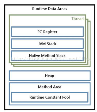 3.内存区(也叫运行时数据区):是在JVM运行的时候操作所分配的内存区。运行时内存区主要可以划分为5个区域,如图: