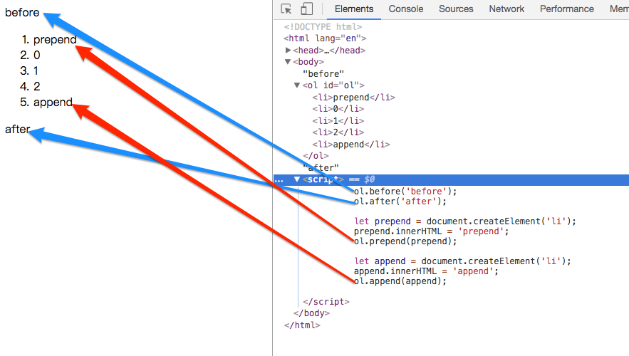 其中prepend()、append()、before()和after()等都是新增的DOM API。有关于它们更详细的介绍,可以阅读 @张鑫旭 老湿写的博文,这篇博文章详细介绍他们怎么使用以及差异。