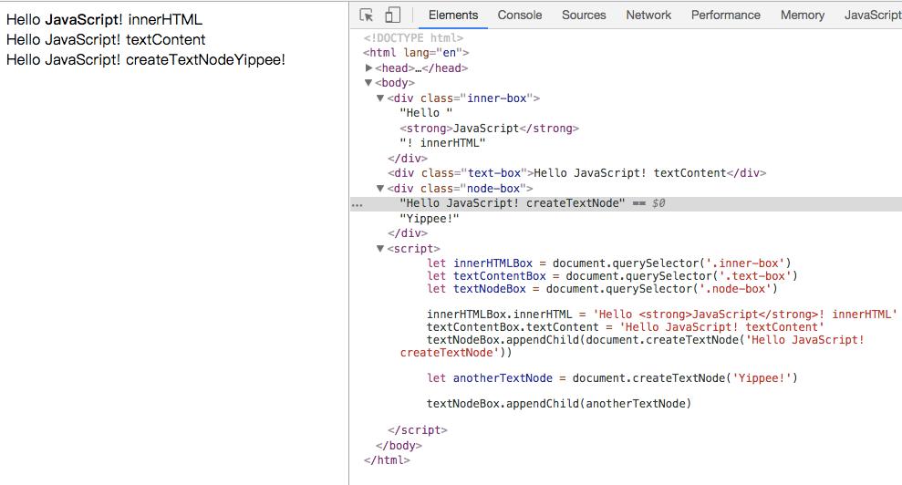textNodeBox.appendChild(document.createTextNode('Hello JavaScript! createTextNode')) let anotherTextNode = document.createTextNode('Yippee!')