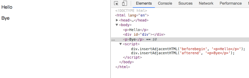 div.insertAdjacentHTML('afterend', '<p>Bye</p>');</script>浏览器渲染出来的结果如下: