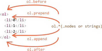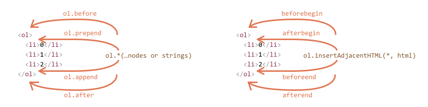 node.append(...nodes or strings)node.prepend(...nodes or strings)node.before(...nodes or strings)node.after(...nodes or strings)node.replaceWith(...nodes or strings)node.remove()