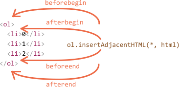 除此之外,还可以根据把给出的一段HTML,通过elem.insertAdjacentHTML(where, html)方法和下面的API,指定HTML片段插入的位置: