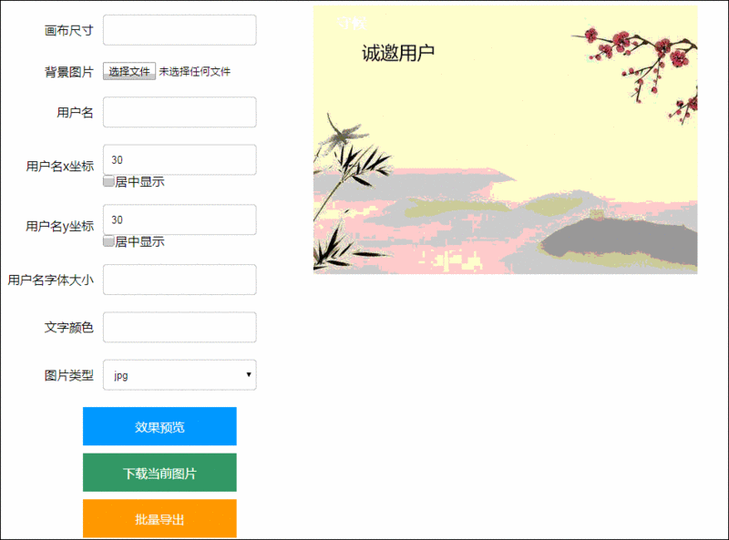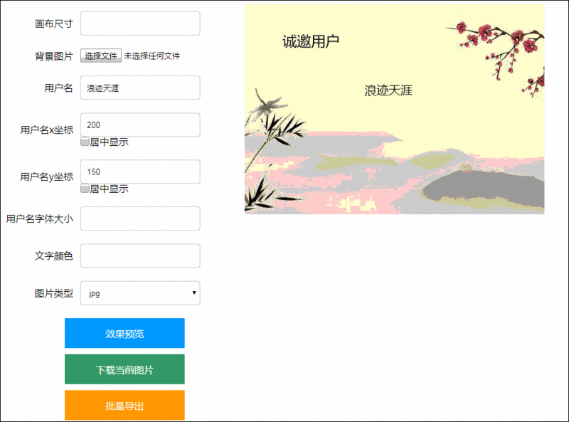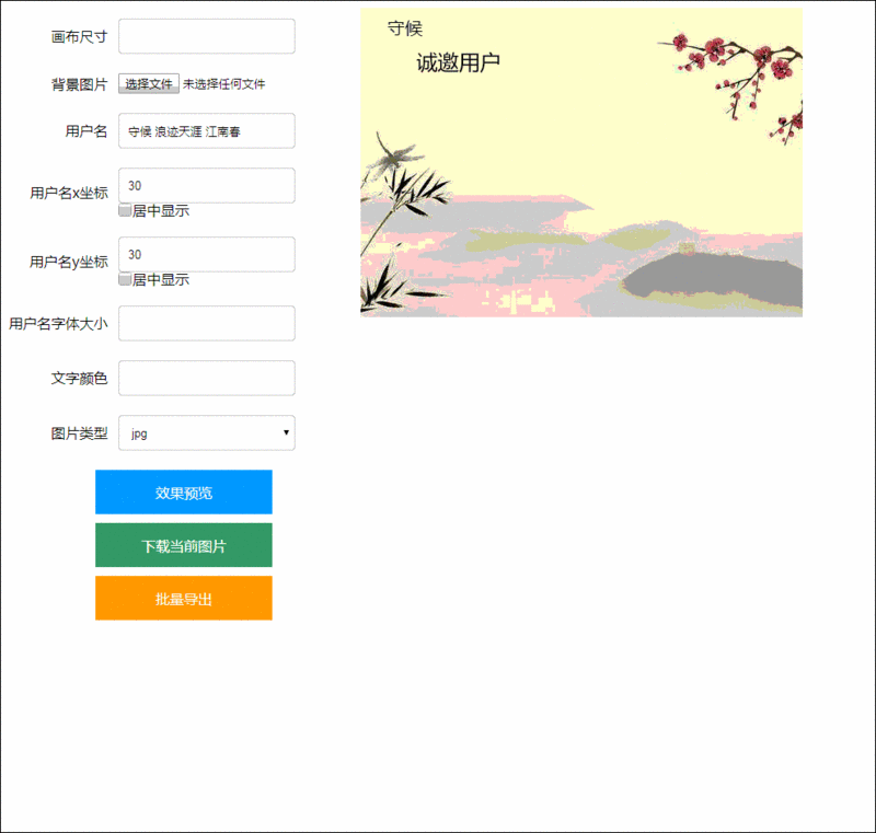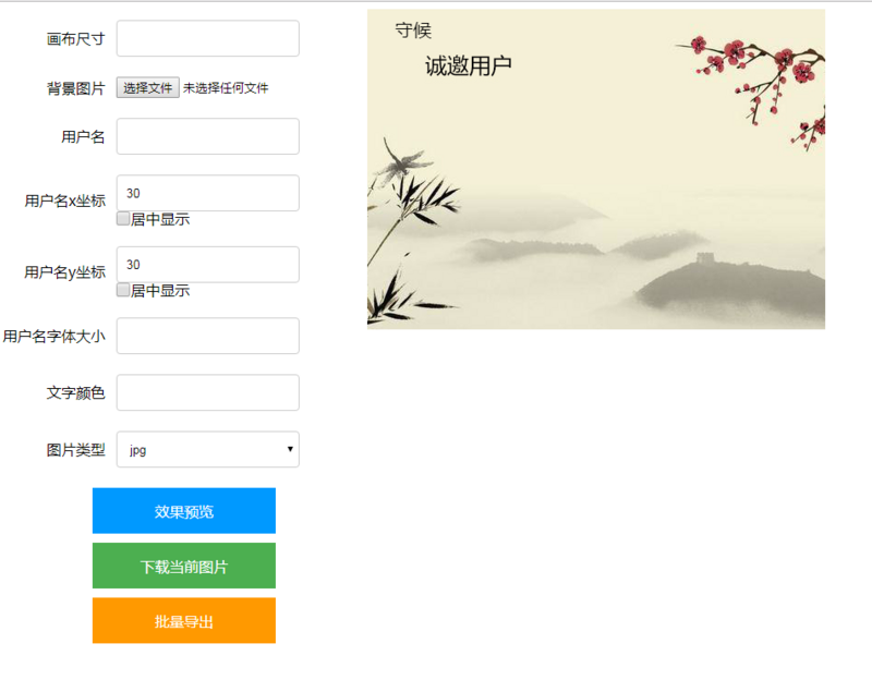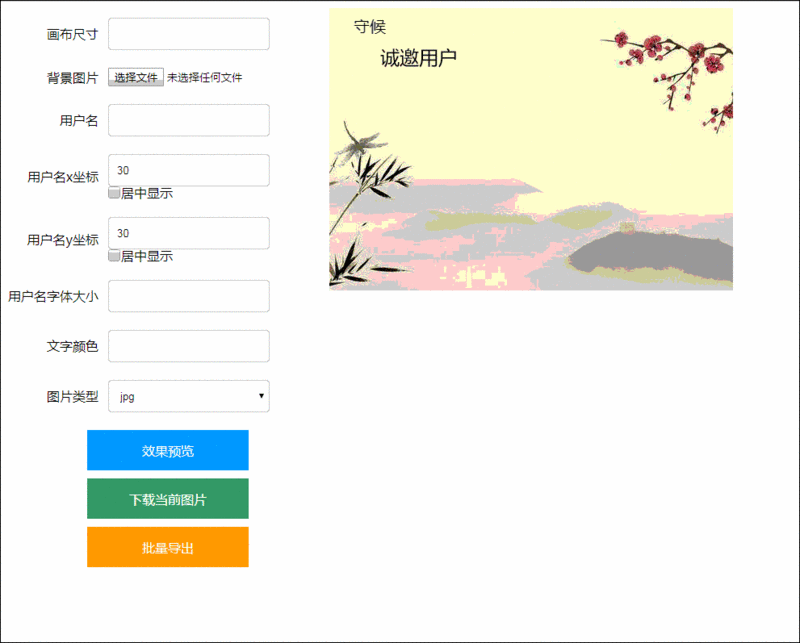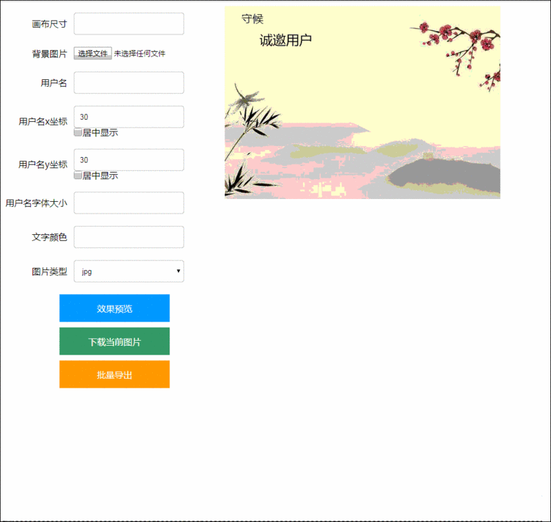 <html><head> <meta charset="utf-8"> <title>下载图片</title> <style> .set-option { float: left; width: 400px; } .set-option .text { width: 200px; height: 40px; padding-left: 10px; border-radius: 4px; border: 1px solid #ccc; } .set-option td { padding: 10px 0; } .set-option td:first-child { text-align: right; padding-right: 10px; } .set-option p { margin: 0; line-height: 16px; } .check-box { width: 16px; height: 16px; margin: 0; vertical-align: top; } button { width: 200px; height: 50px; border: none; color: #fff; font-size: 16px; cursor: pointer; display: block; margin: 10px auto; } button:hover { opacity: .9; } .btn-all { background: #f90; } .btn-save { background: #09f; } .btn-download { background: #4CAF50; } </style></head><body><div> <div class="set-option"> <table> <tr> <td>画布尺寸</td> <td><input type="text" class="text" id="size"/></td> </tr> <tr> <td>背景图片</td> <td><input type="file" id="file"/></td> </tr> <tr> <td>用户名</td> <td> <input type="text" class="text" id="user-name"/> </td> </tr> <tr> <td>用户名x坐标</td> <td> <input type="number" class="text" id="text-option-x"/></br> <p><input type="checkbox" class="check-box" value="1" id="is-center-x">居中显示</p> </td> </tr> <tr> <td>用户名y坐标</td> <td> <input type="number" class="text" id="text-option-y"/></br> <p><input type="checkbox" class="check-box" value="1" id="is-center-y">居中显示</p> </td> </tr> <tr> <td>用户名字体大小</td> <td><input type="number" class="text" id="text-size"/></td> </tr> <tr> <td>文字颜色</td> <td><input type="text" class="text" id="text-color"/></td> </tr> <tr> <td>图片类型</td> <td> <select type="text" class="text" id="img-type"> <option value="jpg">jpg</option> <option value="png">png</option> </select> </td> </tr> </table> <button id="save-image" class="btn-save">效果预览</button> <button id="download-img" class="btn-download">下载当前图片</button> <button id="download-all" class="btn-all">批量导出</button> </div> <div class="show-canvas"> <canvas width=200 height=200 id="thecanvas"></canvas> </div></div></body></html>效果如图,那么大家细想一下,关于一张邀请卡,有什么东西是需要改变的!看到上图相比不难发现!有如下需要改变的属性:图片的大小,图片,用户名,用户名的坐标(x,y,x轴是否居中,y轴是否居中),用户名字体的大小,用户名字体的颜色,以及下载图片的类型。