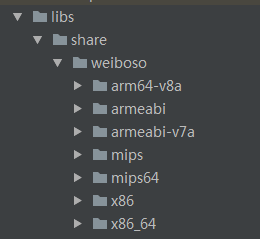 //这里要特别注意,不同文件夹下面的so文件都要报上一级目录包含进来 sourceSets { main { // jniLibs.srcDirs = ['libs/share/weiboso'] jniLibs.srcDirs('libs/share/weiboso','libs')//可变参数,可以加任意个so文件父目录,否则会抛异常 } }1234567配置清单文件及回调Activity编码