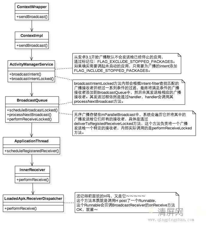 广播的发送有几种:普通广播、有序广播和粘性广播,他们的发送/接收流程是类似的,因此