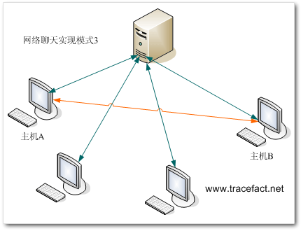 第三种模式是我觉得最简单也最实用的一种,主机的登录与离线与第二种模式相同。注意到每台主机在上线时首先就与服务器建立了连接,那么从主机A发往主机B发送消息,就可以通过这样一条路径,主机A --> 服务器 --> 主机B,通过这种方式,各个主机不需要在对端口进行侦听,而只需要服务器进行侦听就可以了,大大地简化了开发。