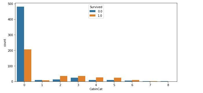 fig, ax = plt.subplots(figsize=(10,5)) sns.countplot(x='CabinCat', hue='Survived',data=df) plt.show()