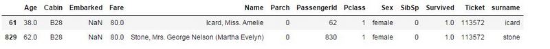 # Embarked缺失值处理 df[df['Embarked'].isnull()]