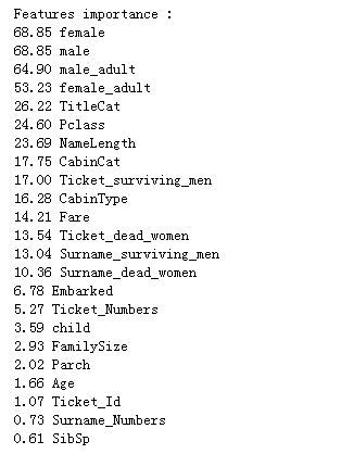 from sklearn.feature_selection import SelectKBest, f_classif,chi2 target = data_train["Survived"].values features= ['female','male','Age','male_adult','female_adult', 'child','TitleCat', 'Pclass','Ticket_Id','NameLength','CabinType','CabinCat', 'SibSp', 'Parch', 'Fare','Embarked','Surname_Numbers','Ticket_Numbers','FamilySize', 'Ticket_dead_women','Ticket_surviving_men', 'Surname_dead_women','Surname_surviving_men'] train = df[0:891].copy() test = df[891:].copy() selector = SelectKBest(f_classif, k=len(features)) selector.fit(train[features], target) scores = -np.log10(selector.pvalues_) indices = np.argsort(scores)[::-1] print("Features importance :") for f in range(len(scores)): print("%0.2f %s" % (scores[indices[f]],features[indices[f]]))此部分将之前训练和测试合并的数据集分开,因为最后我们要对测试集进行预测。特征选择权重结果如下(可以通过可视化的方法展示出来):