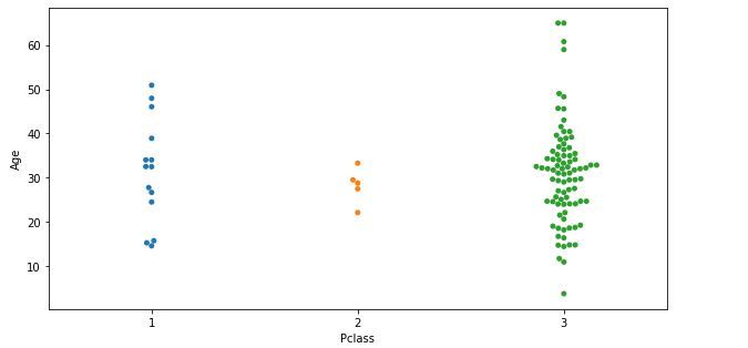 # Age缺失值填补后的情况 X_test['Age'] = pd.Series(age_preds) f,ax=plt.subplots(figsize=(10,5)) sns.swarmplot(x='Pclass',y='Age',data=X_test) plt.show()