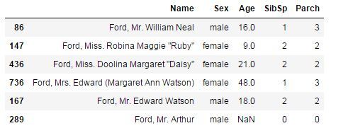 df.loc[df['surname']=='ford',['Name','Sex','Age','SibSp','Parch']]