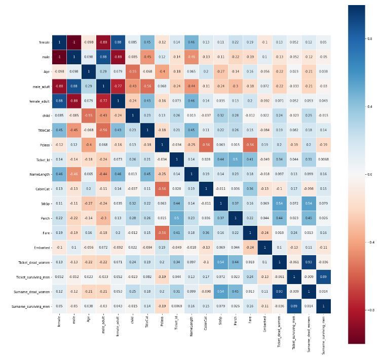 features_selected = features # data_corr df_corr = df[features_selected].copy() colormap = plt.cm.RdBu plt.figure(figsize=(20,20)) sns.heatmap(df_corr.corr(),linewidths=0.1,vmax=1.0, square=True, cmap=colormap, linecolor='white', annot=True) plt.show()