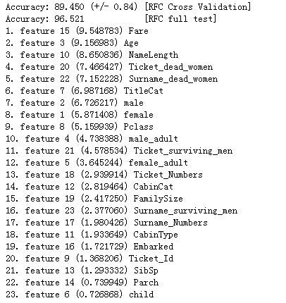 from sklearn import cross_validation rfc = RandomForestClassifier(n_estimators=3000, min_samples_split=4, class_weight={0:0.745,1:0.255}) # rfc = AdaBoostClassifier(n_estimators=3000, learning_rate=0.1, random_state=1) # 交叉验证,建模随机森林 kf = cross_validation.KFold(train.shape[0], n_folds=3, random_state=1) scores = cross_validation.cross_val_score(rfc, train[features_selected], target, cv=kf) print("Accuracy: %0.3f (+/- %0.2f) [%s]" % (scores.mean()*100, scores.std()*100, 'RFC Cross Validation')) rfc.fit(train[features_selected], target) score = rfc.score(train[features_selected], target) print("Accuracy: %0.3f [%s]" % (score*100, 'RFC full test')) importances = rfc.feature_importances_ indices = np.argsort(importances)[::-1] for f in range(len(features_selected)): print("%d. feature %d (%f) %s" % (f + 1, indices[f]+1, importances[indices[f]]*100, features_selected[indices[f]]))为防止过拟合,采用了K折交叉验证进行采样。集成学习等高级模型有自带的特征打分方法,训练数据后,我们可以通过feature_importances得到特征权重分数(当特征特别多时,也可以作为初始的特征筛选方法)。当然这也可以通过可视化的方法展示出来。