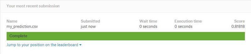 # 输出文件 PassengerId =np.array(test["PassengerId"]).astype(int) my_prediction = pd.DataFrame(predictions, PassengerId, columns = ["Survived"]) my_prediction.to_csv("my_prediction.csv", index_label = ["PassengerId"])最后,将预测结果输出到excel表中。如果你到Kaggle将输出的数据提交,你应该得到的分数是:0.8188,也就是说你的准确率是0.8188。这个分数可以达到500/11000的排名(top5%)。