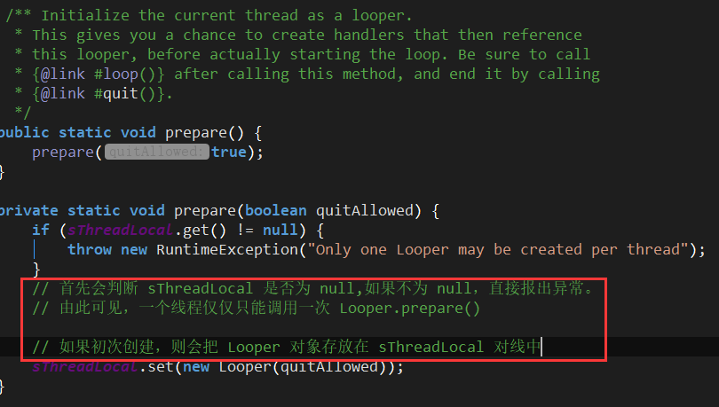 前面我们说到 Looper 是通过 Looper.prepare() 和 Looper.prepareMainLooer() 创建的,我们不妨看看源码里面到底做了什么。