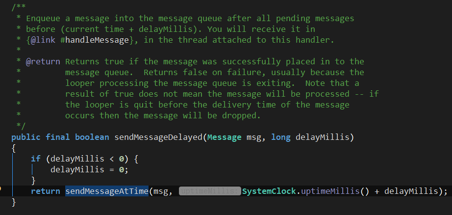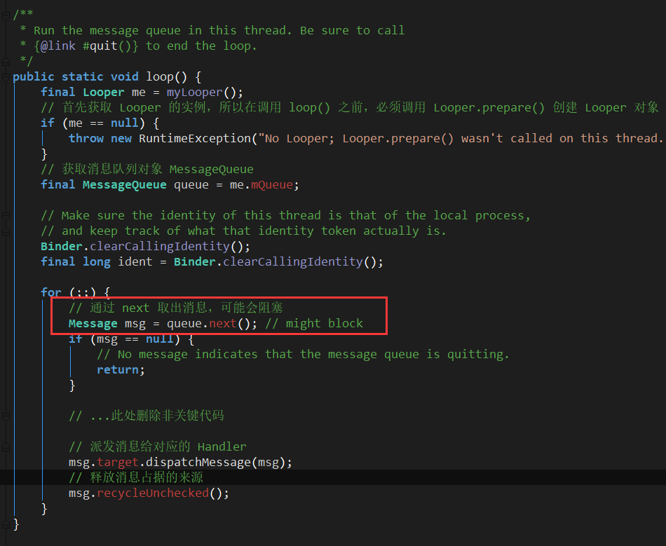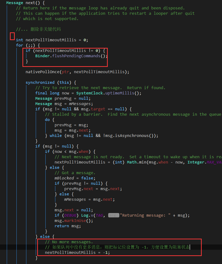 截图中的代码比较简单,大家应该不难看懂,我们再看看如何通过 MessageQueue.next() 来取消息设置阻塞状态的。