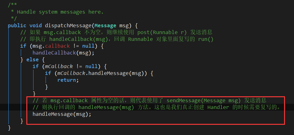 dispatchMessage(msg)方法中,会进行 1 次发送方式判断: