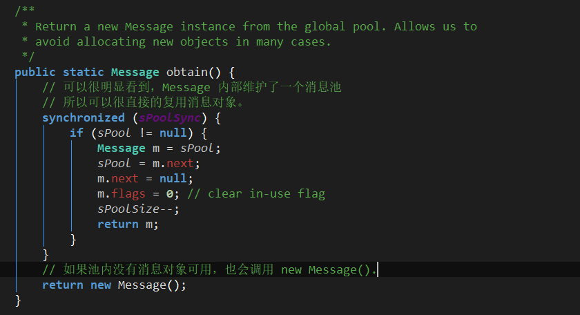 我们经常会在 Handler 的使用中创建消息对象 Message,创建方式也有两个 new Message() 或者 Message.obtain()。我们通常都更青睐于 Message.obtain() 这种方式,因为这样的方式,可以有效避免重复创建 Message 对象。实际上在代码中也是显而易见的。