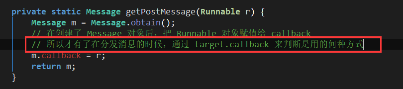 我们上面的分析是对的。在 getPostMessage(Runnable r) 方法中,我们除了通过 Message.obtain() 方法来创建消息对象外,专门把 Runnable 对象赋值给了 callback,这样才用了上面做消息分发的时候,通过这个标记来判断是用的 post() 还是 sendMessage() 方式。