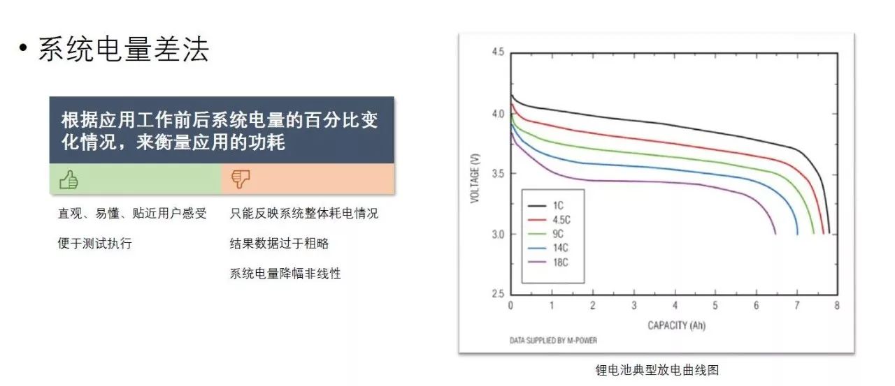 另外一个就是大家可能都遇到这样的情况,明明手机还有20%的电,掏出来用了不到几分钟就突然黑屏、没电、关机了,这是因为系统的电量降幅,在很多手机上不是线性的。就像下图右侧的这个图,是一个锂电池的放电曲线图,可以看到最前面一部分是比较平缓的,从100%比如说到20%这一段区间内,系统电量的百分比跟存量电量的情况是呈比例关系的。但到最右边这块可以看到曲线是急转直下,也就是说到最后这一段系统电量的百分比变化会变快。所以说这个对于我们用它来做功耗测试来讲其实就是结果会比较粗略。