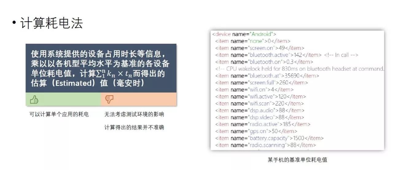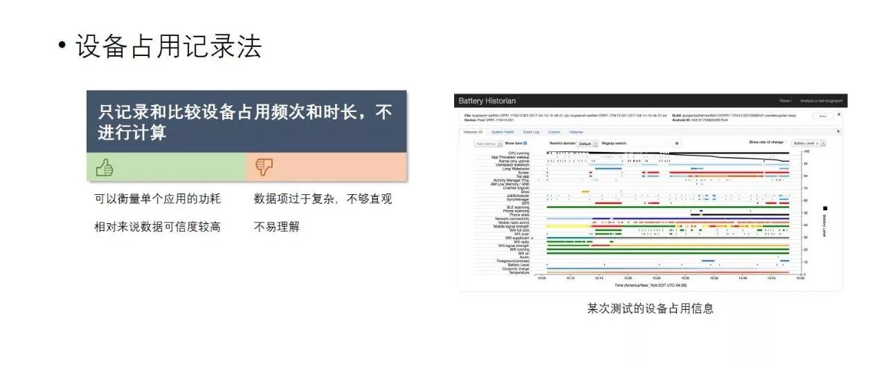 数据项太多,不够直观。一方面,手机里面会耗电的设备比较多,每一项都需要对它进行频次和时长占用的比较,就会比较复杂,另一方面前,这个方法不会落实到某一个数上,数据可能会是一组数,复杂不够直观。