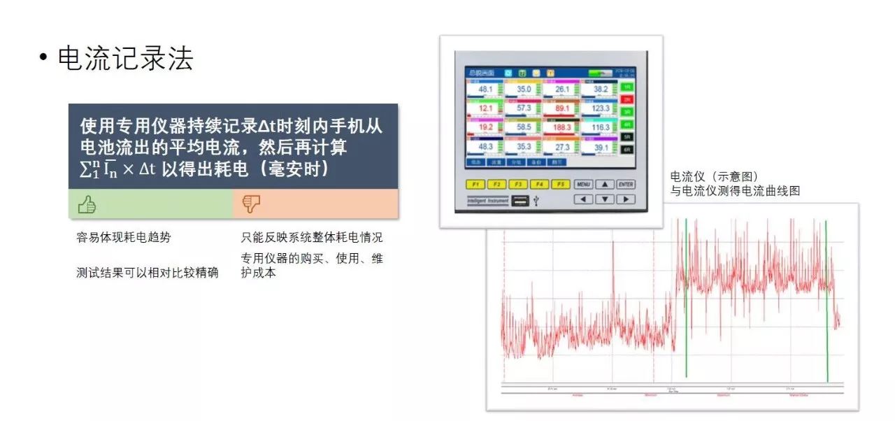 专用仪器的购买使用和维护的成本比较高的。之前百度也用过电流仪设备,包括百度的MTC在内,也是用这样一个电流仪设备,给大家提供耗电测试