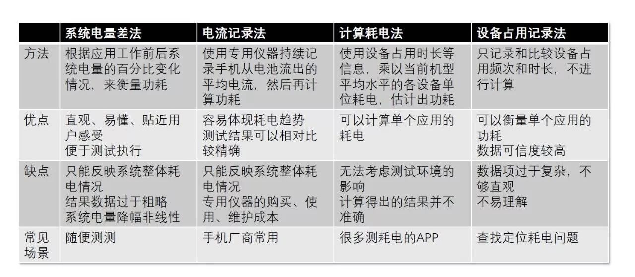 介绍完这四种方法大家也可以看出,我们现存所用的这种测试功耗的这四种方法,其实没有一种是完美的,这也是我们现在所面临的这样一个现实的问题,就是没办法只用一种方法去对应用的功耗进行测试。所以在实际的使用过程中,就是我们只能说按照我们的需求、按照测试的这种需要,去选取更适合我们当前测试的这样一个功耗测试的方法。
