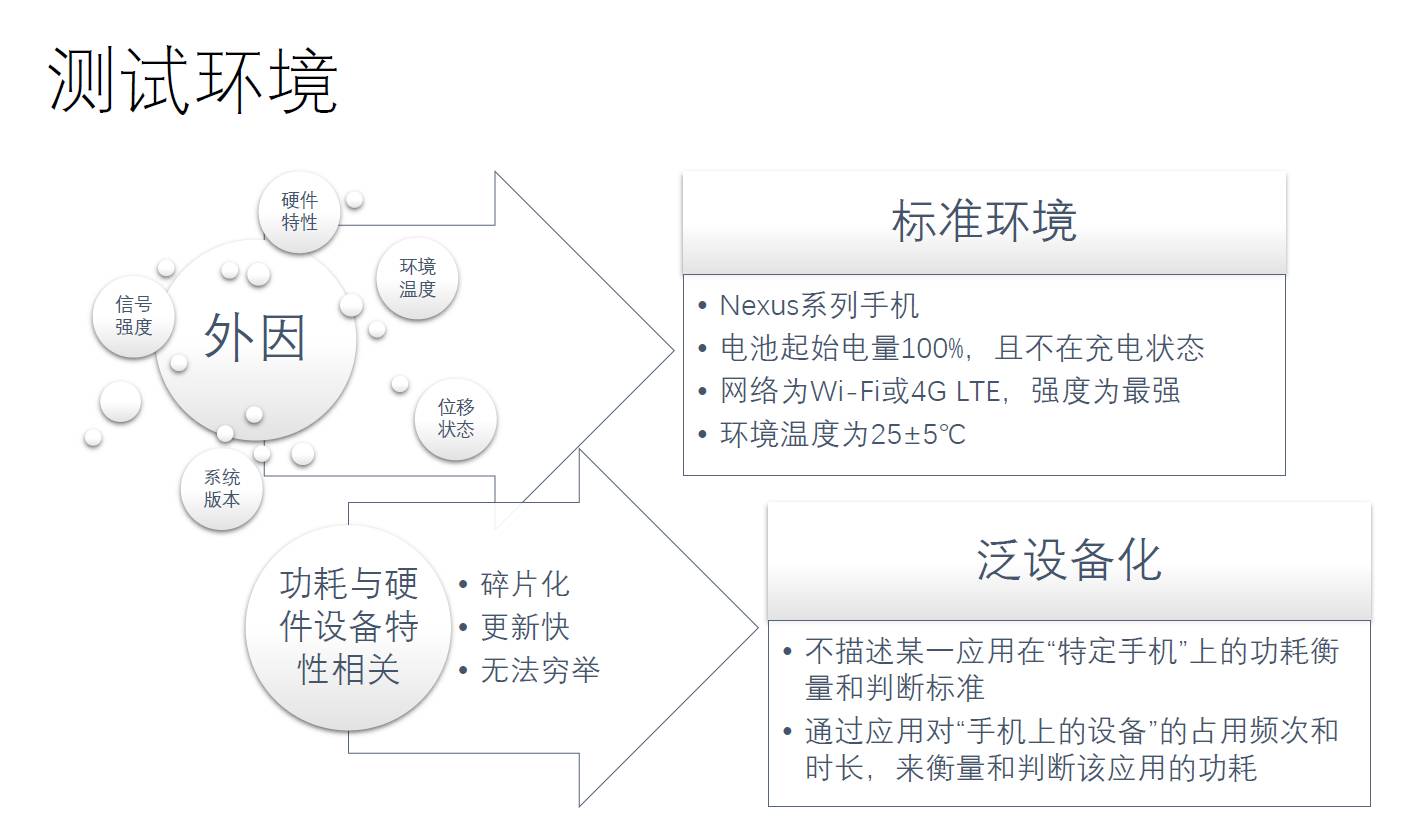 无法控制测试环境的影响。比如说手机所处的地理位置、它的海拔、手机运动的状况还有周围环境的温度,都会影响设备的耗电速度。