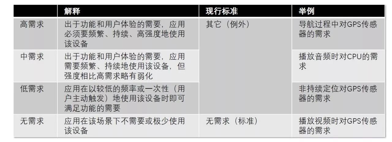 标准中对应用测试的使用场景进行了划分,按照应用对手机内设备的需求程度进行了划分,分成四类:分别是高需求、中需求、低需求和无需求。