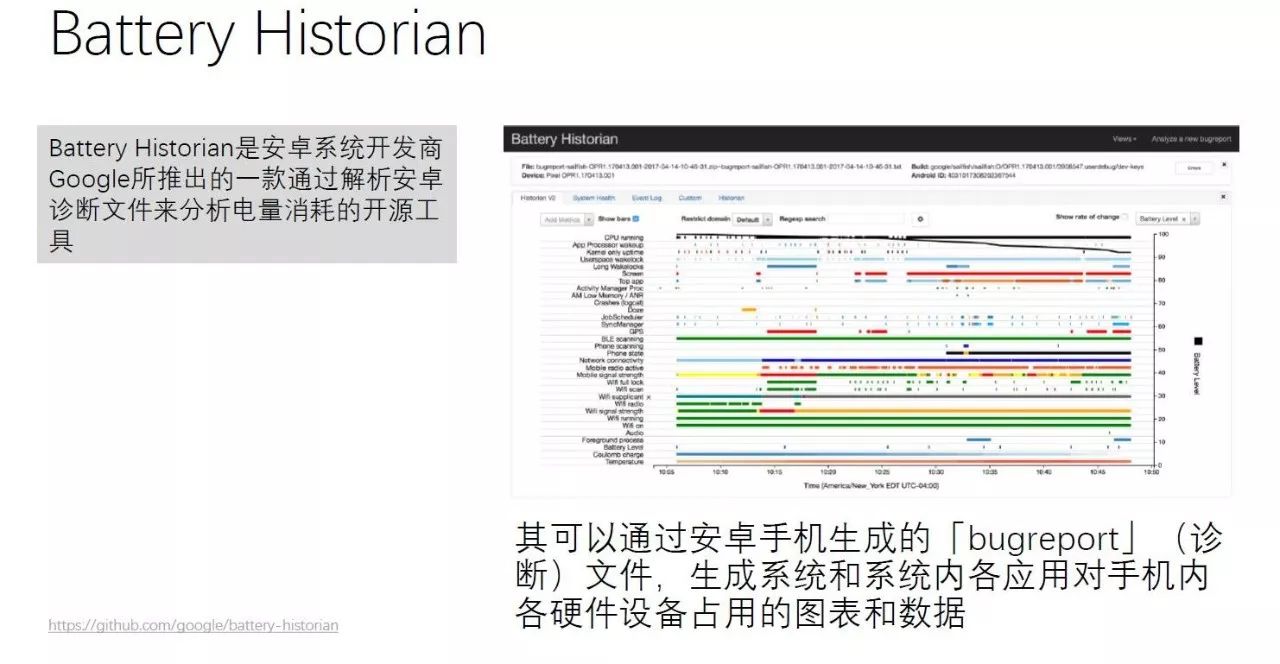 Battery Historian这个工具是包括百度等很多业界公司都在使用的,这个工具其实是刚才我们提到的四种测试方法里面的第四种。这个工具是安卓开发商做的解析诊断文件,用来分析电量消耗的开源工具。大家访问链接: