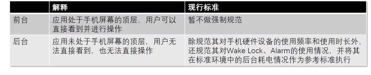 解释一下我们现在的标准,这个标准只针对应用在后台的功耗情况进行限制。我们做了一些用户的调研,发现用户其实更关注某一个应用在后台的时候它是不是耗电。所以在前台,我们现行的标准就没有做强制的规范,但是我们现行的"安卓绿色联盟"的功耗标准,对应用在后台进行了严格的规范,包括规范这个应用对手机用电设备的使用频率和使用时长,还规范了对WakeLock、Alarm的使用情况,并且我们还把应用在标准环境中后台的耗电情况也作为参考标准进行执行。