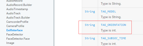 没错,这里面就有一个旋转角度,倘若拍照后保存的成像照片文件发生了角度旋转,这个图片的属性参数就能告诉我们到底旋转了多少度。只要获取到这个角度值,我们就能进行纠正的工作了。 Android 系统提供了 ExifInterface 类来满足获取图片各个属性的操作