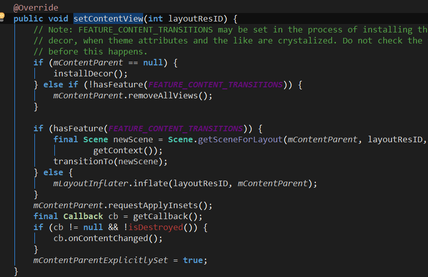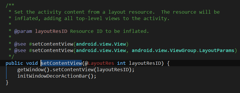 我们来直接看看实战中的代码,相信大家都知道 Activity 通过 setContentView() 方法来加载布局,我们来看看 setContentView() 方法到底是怎样做的。