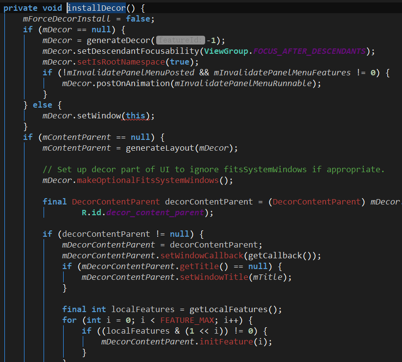 这里代码挺多,我就不截完了,但逻辑不难,我们先判断 mDecor 是否为 null,如果是,则直接初始化它。然后判断 mContentParent 是否为 null,如果是,则直接通过 mDecor 去初始化 mContentParent。