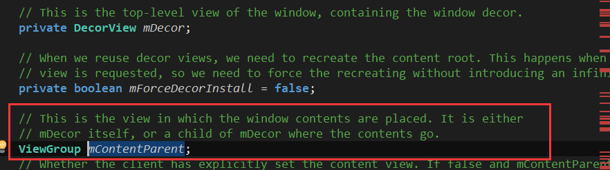 这个 mContentParent 是一个 ViewGroup 对象,而从注释中可以明显地看到 Window 中的内容就放置在这里。如果为空,则直接执行 installDecor(),这里想都不用想都知道是在实例这个 mContentParent,我们可以直接进入源码来验证我们的猜想。