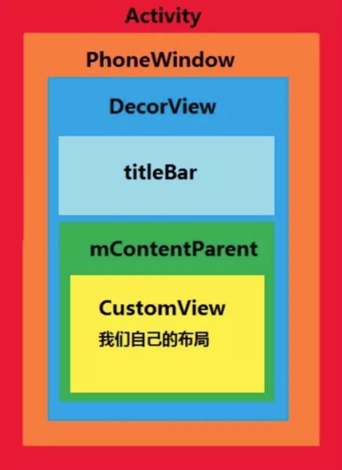 每个 Activity 包含了一个 Window 对象,这个对象是由 PhoneWindow 做的实现。而 PhoneWindow 将 DecorView 作为了一个应用窗口的根 View,这个 DecorView 又把屏幕划分为了两个区域:一个是 TitleView,一个是 ContentView,而我们平时在 Xml 文件中写的布局正好是展示在 ContentView 中的。