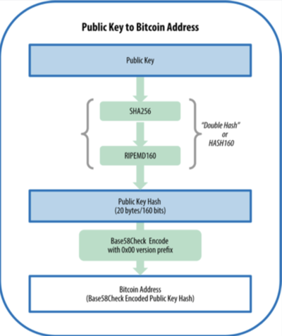 从比特币公钥和地址这两个字符串可以看出,公钥的生成算法无非是从一个长字符串转换为另一个短字符串,这个转化过程分为两步