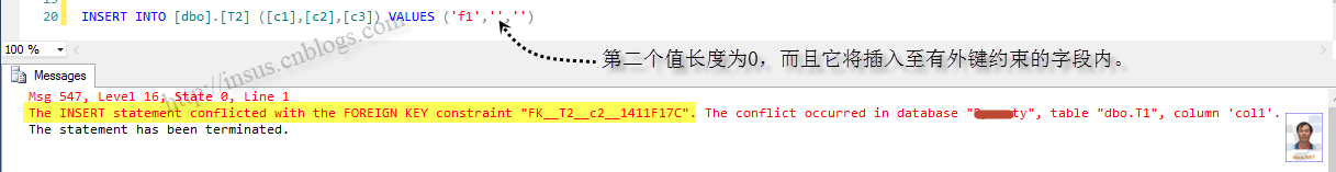 首先创建两个表,[dbo].[T1]是主表,[dbo].[T2]是子表,而子表的[c2]是一个有外键约束的字段。