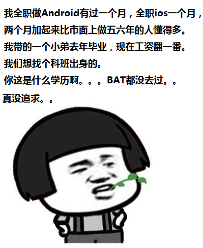 招聘上写的是1-3年经验,去面试的时候,叫他做一个面试题,都是理论性的,一看就是百度的,比如:世 界上第一台计算机诞生于哪一年?简述一下计算机语言发展史等。。。最后面谈的时候,面试官给我朋友说 想找个科班出身的,我朋友说:“你这就是找应届生啊?我可是工作了2年的。”然后面试官问了一些看起来很 高大上的问题,如下: ==》 听说过BAT吗?BAT的CTO的和主要技术人员名字你知道几个?说来听听。 ==》 甲骨文告谷歌是因为什么?细节能说说吗? ==》 谷歌Android原生代码 包结构是怎么来的? ==》 你能说说四大组件源代码有多少行吗? ==》 View的源码有多少行?不要说你用过哪些View的方法,我就问你阅读代码能做到读新闻那样吗? ==》 一个星期多少个小时?一年多少个小时?面试官说他要是工作四年Android源码每天看一百行,都能背几遍了。 面试官说他全职做Android有过一个月,全职ios一个月,然后那两个月加起来绝对比市面上做五六年的人懂 得多。还吹牛说他带的一个小弟去年毕业,现在工资翻一番。不得不说这是一个装逼的面试官,这种公司不 去也罢,太坑了,万一是跟你一起做Android开发或者你的领导,你要被坑死。