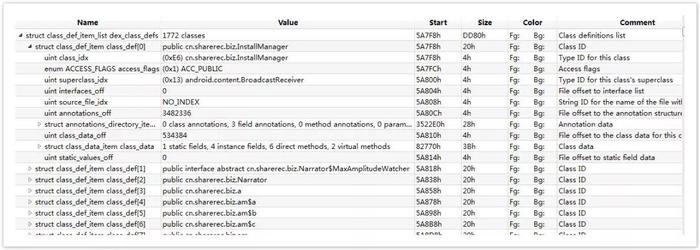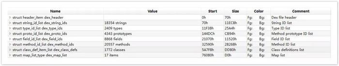 map_list 里先用一个 uint 描述后面有 size 个 map_item,后续就是对应的 size 个 map_item 描述。 map_item 结构有 4 个元素: type 表示该 map_item 的类型,Dalvik Executable Format 里 Type Code 的定义; size 表示再细分此 item,该类型的个数;offset 是第一个元素的针对文件初始位置的偏移量; unuse 是用对齐字节的,无用。