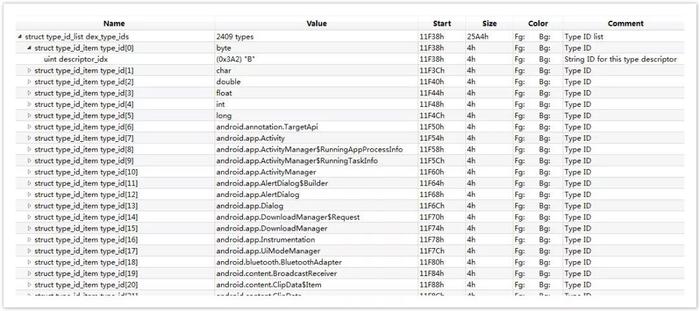 type_ids 区索引了 dex 文件里的所有数据类型,包括 class 类型,数组类型(array types)和基本类型(primitive types)。区段里的元素格式为 type_ids_item
