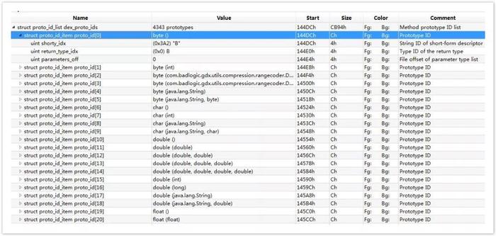 proto 的意思是 method prototype 代表 java 语言里的一个 method 的原型 。proto_ids 里的元素为 proto_id_item