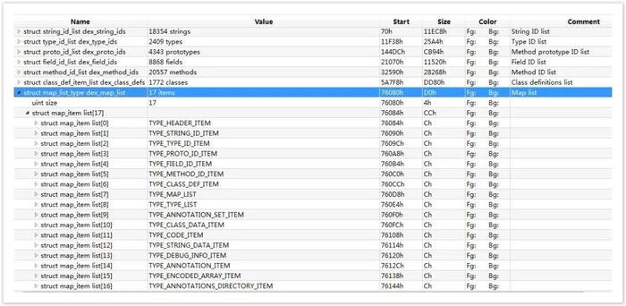 map_list 中大部分 item 跟 header 中的相应描述相同,都是介绍了各个区的偏移和大小,但是 map_list 中描述的更加全面,包括了 HEADER_ITEM 、TYPE_LIST、STRING_DATA_ITEM、DEBUG_INFO_ITEM 等信息。