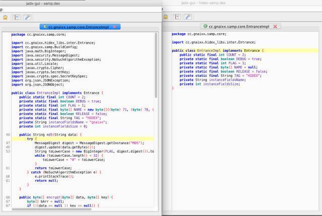 混淆加 密主要是为了隐藏 dex 文件中关键的代码,力度从轻到重包括:静态变量的隐藏、函数的重复定义、函数的隐藏、以及整个类的隐藏。混淆后的 dex 文件依旧可以通过 dex2jar jade 等工具的反编译成 Java 源码,但是里面关键的代码已经看不到了。