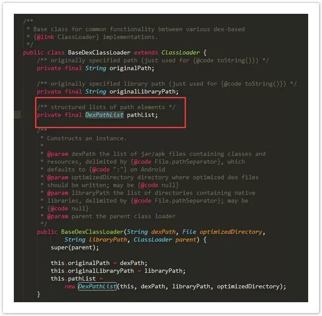 PathClassLoader和DexClassLoader类的父加载器是BootClassLoader,他们的父类是BaseDexClassLoader。里面有一个DexPathList对象,在来看一下DexPathList.java源码: