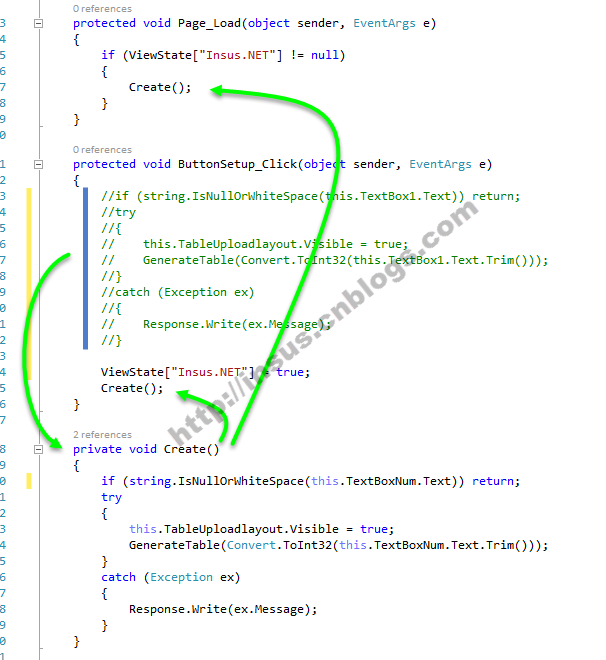 DataTable td = new DataTable(); td.Columns.Add("ImgSource", typeof(string)); td.Columns.Add("Title", typeof(string)); td.Columns.Add("Description", typeof(string)); td.Columns.Add("Album", typeof(string)); int rowIndex = 0; for (int idx = 0; idx < TableUploadlayout.Rows.Count; idx++) // (TableRow tr in TableUploadlayout.Rows) { if (idx != rowIndex) //略过表格头行。 { string imgSource = string.Empty; string title = string.Empty; string desc = string.Empty; string album = string.Empty; foreach (TableCell tc in TableUploadlayout.Rows[idx].Cells) { foreach (Control ctl in tc.Controls) { if (ctl is FileUpload) { FileUpload fud = (FileUpload)ctl; string uploadfile = fud.PostedFile.FileName; //处理图片存储... imgSource = uploadfile.Substring(uploadfile.LastIndexOf(@"\") + 1); } if (ctl is TextBox) { TextBox tb = (TextBox)ctl; int id = Convert.ToInt32(tb.ID.Substring(7)); if (id % 2 == 1) //第一个文本框 title = tb.Text; if (id % 2 == 0) //第二个文本框 desc = tb.Text; } if (ctl is DropDownList) { DropDownList ddl = (DropDownList)ctl; album = ddl.SelectedValue; } } } td.Rows.Add(imgSource, title, desc, album); } } TData tData = new TData(); tData.TD = td; tData.AddRecord();View Code