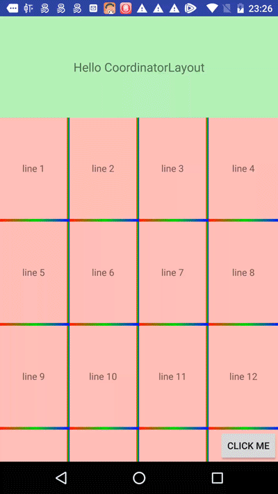 1 2 3 4 5 6 7 8 9 10 11 12 13 14 15 16 17 18 19 20 21 22 23 24 25 26 27 28 29 30 | android.support.design.widget.CoordinatorLayout xmlns:android="http://schemas.android.com/apk/res/android" xmlns:app="http://schemas.android.com/apk/res-auto" xmlns:tools="http://schemas.android.com/tools" android:id="@+id/activity_behavior" android:layout_width="match_parent" android:layout_height="match_parent"> <TextView android:layout_width="match_parent" android:layout_height="150dp" android:background="#4400ff00" android:gravity="center" android:text="Hello CoordinatorLayout" android:textSize="18dp" app:layout_behavior="leon.com.allkindsoflistview.MyBehavior" /> <android.support.v7.widget.RecyclerView android:id="@+id/recycler" android:layout_width="match_parent" android:layout_height="match_parent" app:layout_behavior="leon.com.allkindsoflistview.RecyclerBehavior" /> <Button android:id="@+id/button" android:layout_width="wrap_content" android:layout_height="wrap_content" android:layout_gravity="bottom|right" android:text="Click Me" /> </android.support.design.widget.CoordinatorLayout> |