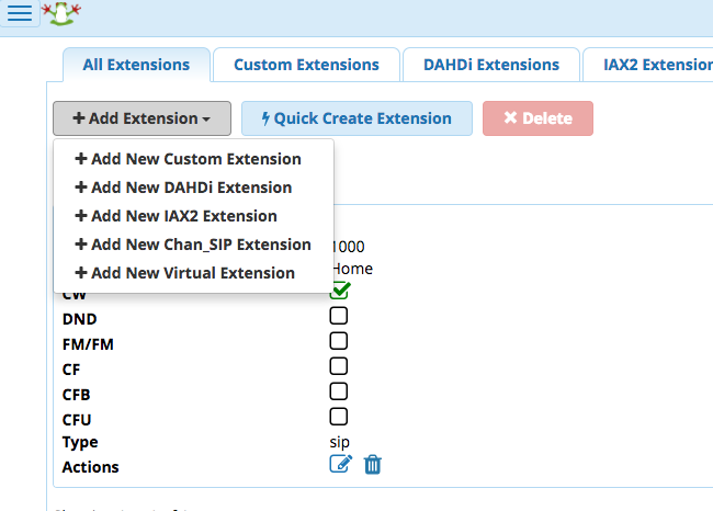 登录之后,我进入位于显示屏左上方的应用菜单Application Menu。点击菜单链接并选择了第二个选项,即 “应用”Applications,接着选择了第四个选项,“分机”Extensions。从那里我选择创建一个 New Chan_Sip 分机。